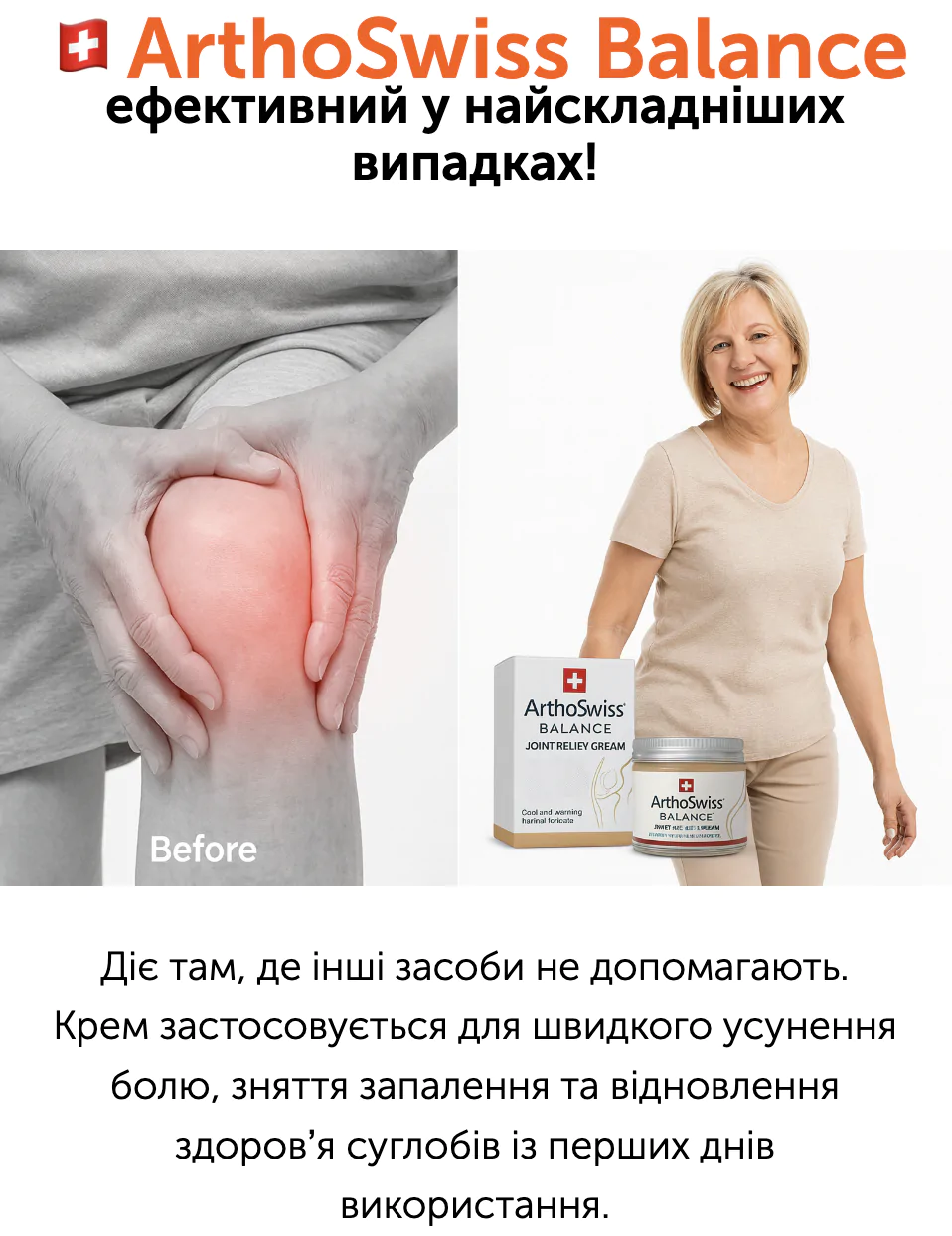 Це повністю натуральний продукт швейцарського виробництва, який допомагає не лише усунути симптоми, а й відновити структуру суглобів, покращити кровообіг і повернути рухливість без болю.”