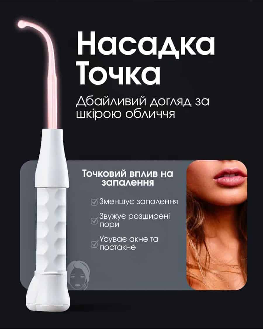 Прилад ефективно бореться з акне, постакне, пігментацією та локальними проблемними зонами. Імпульсні мікроструми стимулюють регенерацію, прискорюють кровообіг і зміцнюють судини.