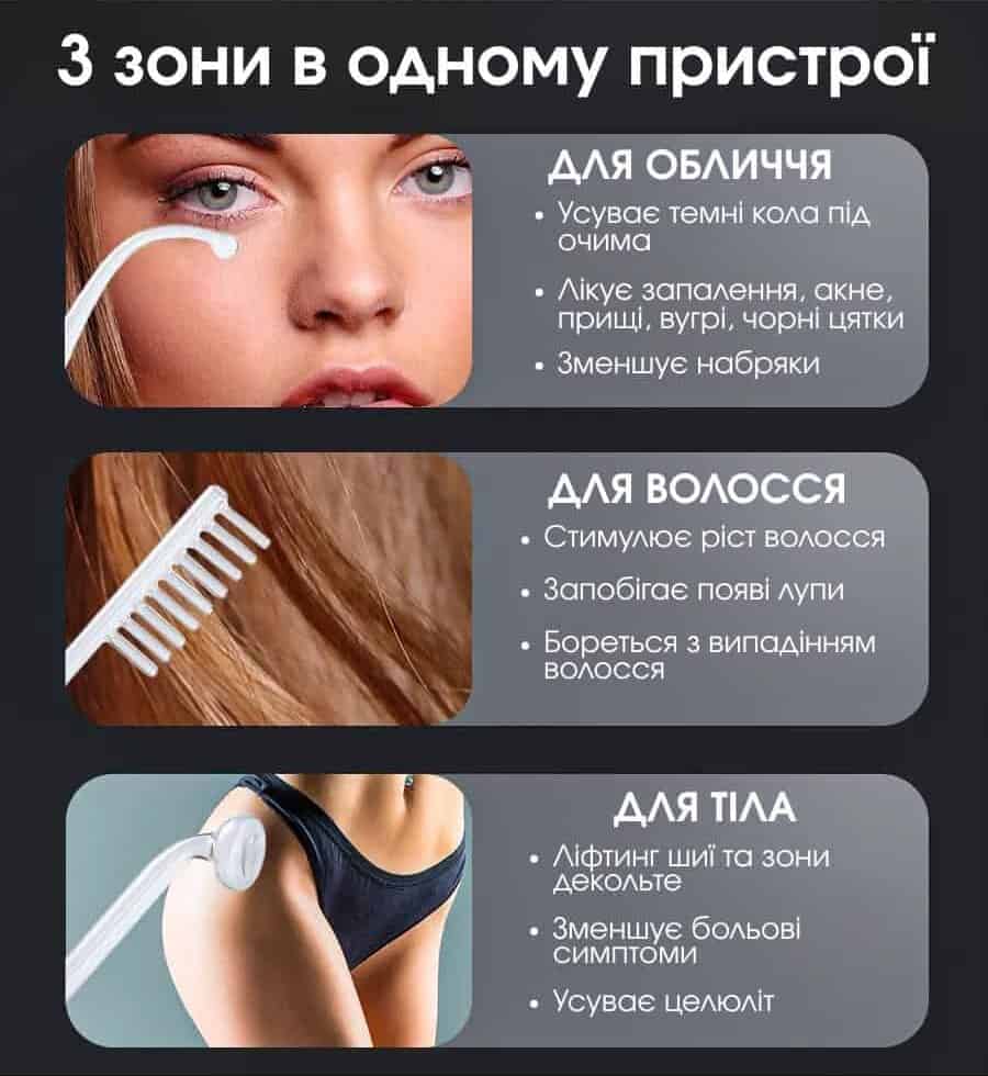 Для волосся це справжній порятунок: дарсонваль зупиняє випадіння, активує ріст, усуває свербіж і покращує живлення фолікулів. Процедури підходять як професіоналам, так і для домашнього догляду.