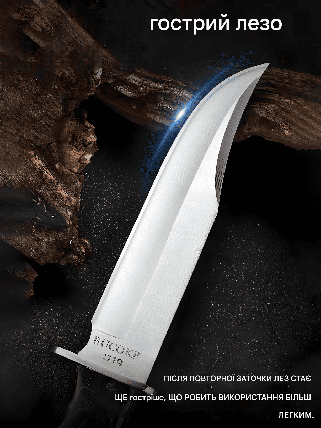 Ніж BUCK 119 має монолітний сталевий корпус з високоякісної сталі 420HC, гострий клинок Clip-point для точних розрізів. Зручна рукоятка з металевою гардою та еко-шкіряні ножни забезпечують комфорт і надійність. Ідеальний для полювання та туризму.